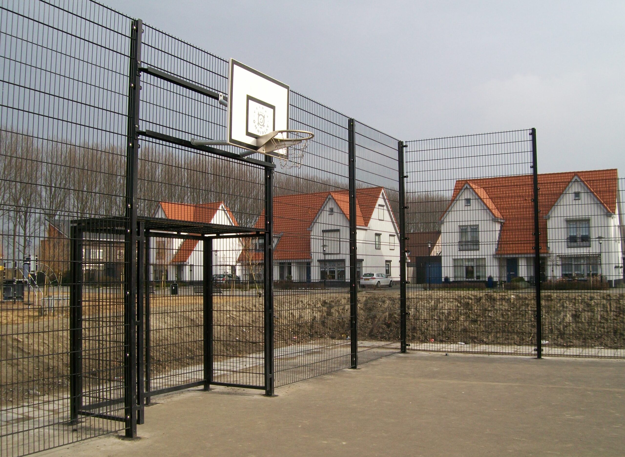 De solide constructie, van deze voetbaldoel, basketbalwand, is van zwaar kokerprofiel. 80 x 80mm. Gevuld met dubbelstaafmat. Het geheel is thermisch verzinkt. Het geintegreerde voetbaldoel is naar keuze: