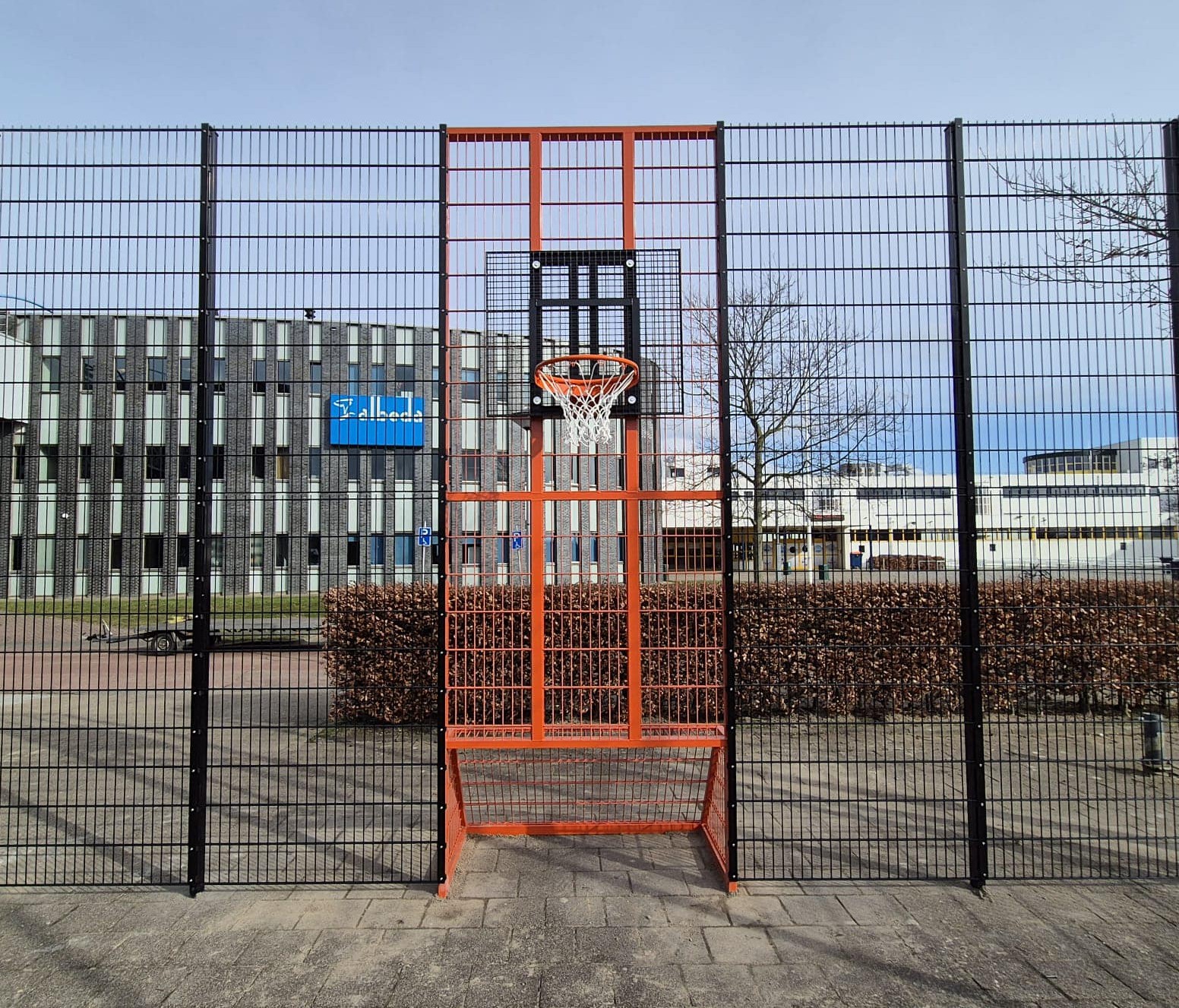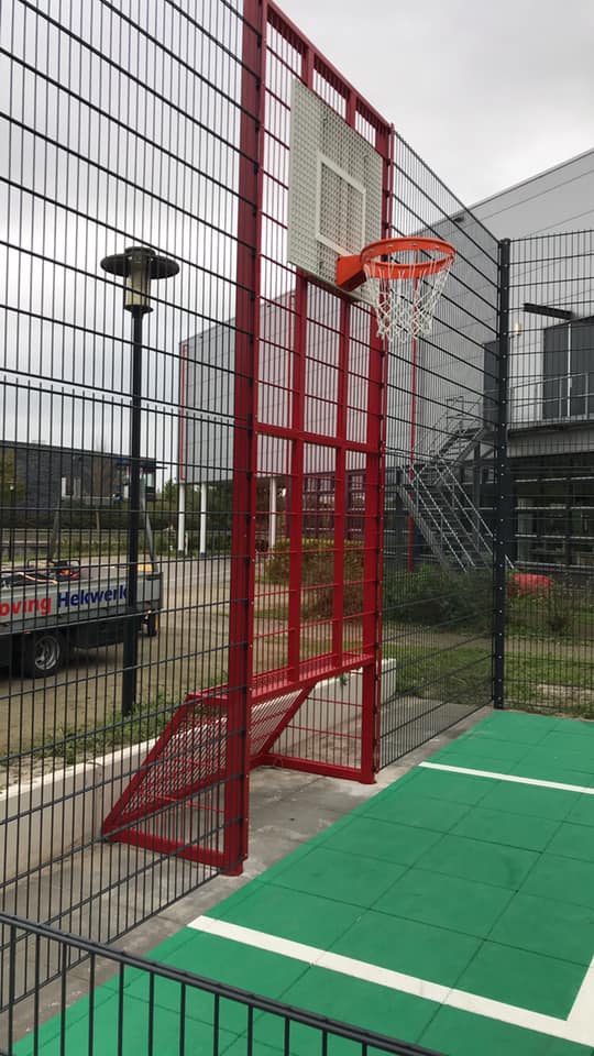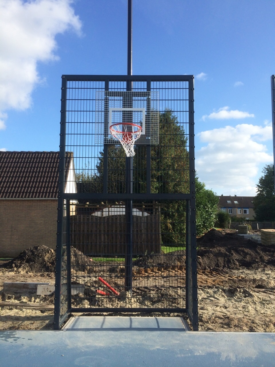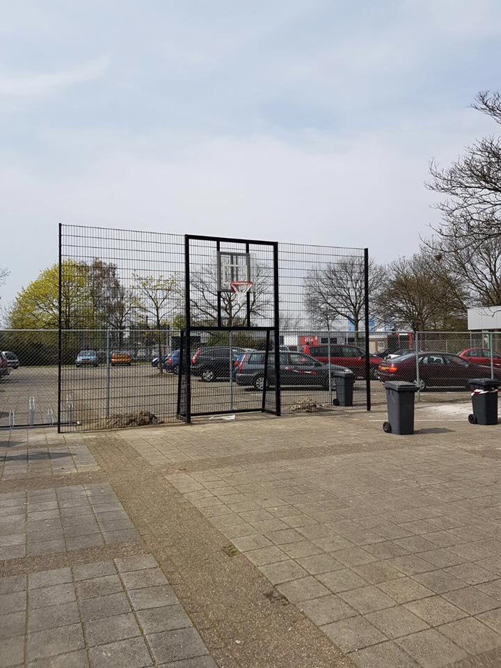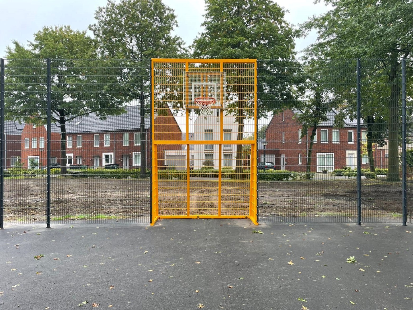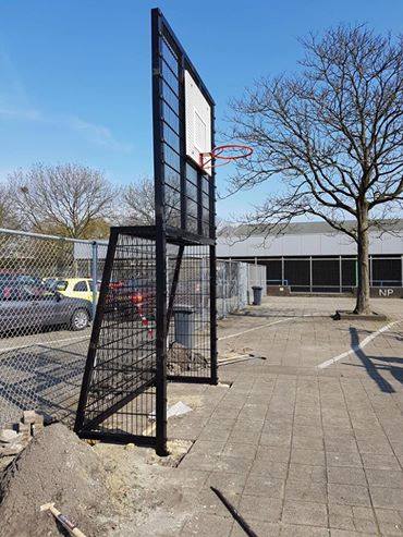 Tussen het geluidsarme vandalisme bestendige basketbalbord en de constructie, zit rubber zodat ook hier geen metaal op metaal geluid ontstaat!