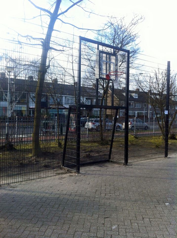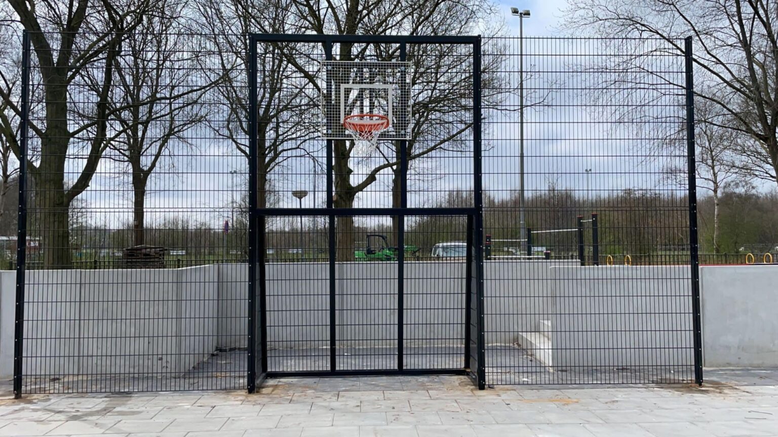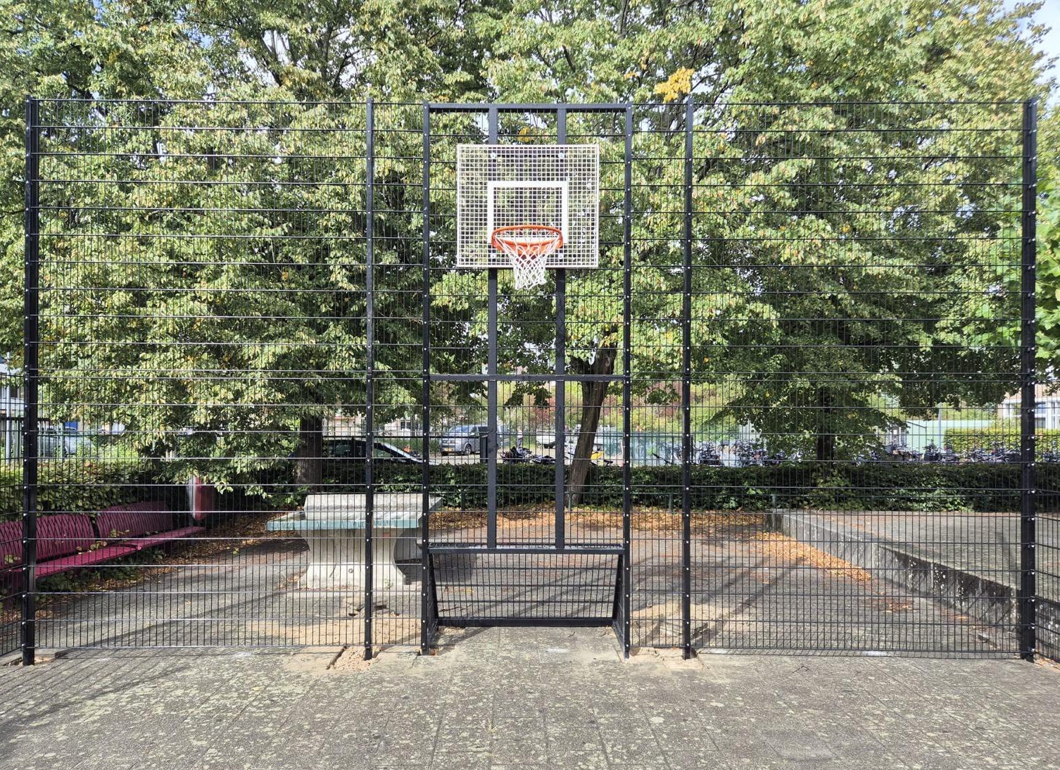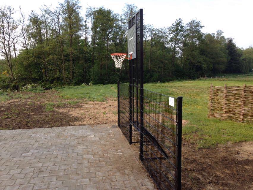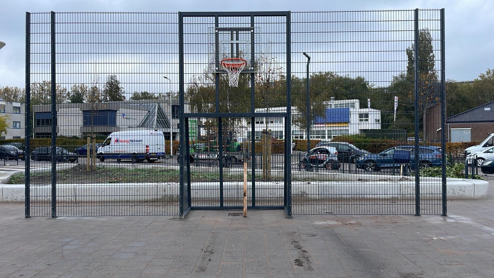 Tussen het geluidsarme vandalisme bestendige basketbalbord en de constructie, zit rubber zodat ook hier geen metaal op metaal geluid ontstaat!