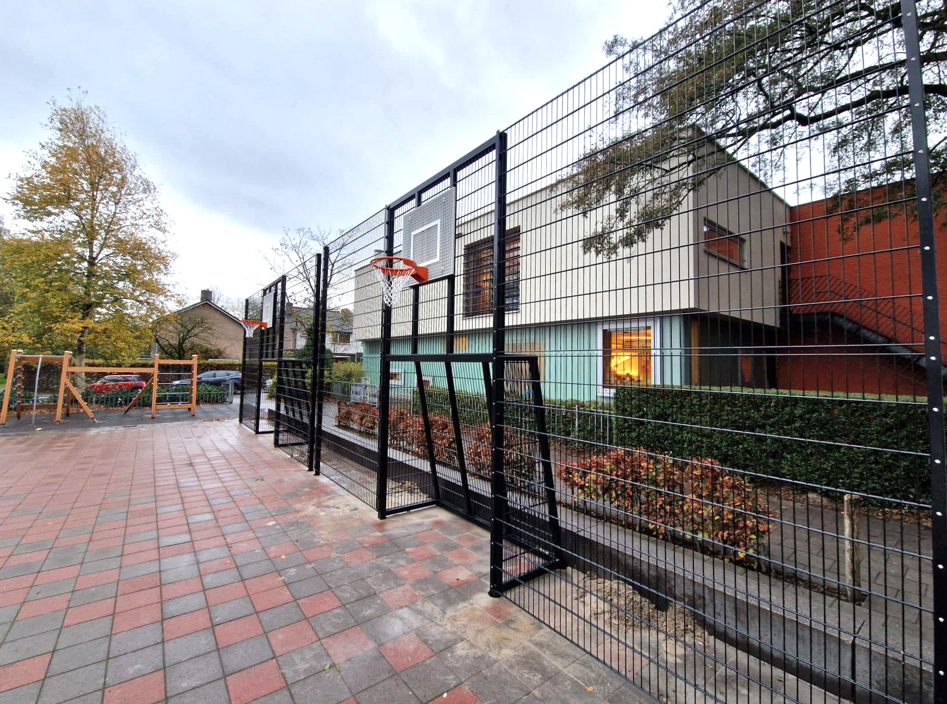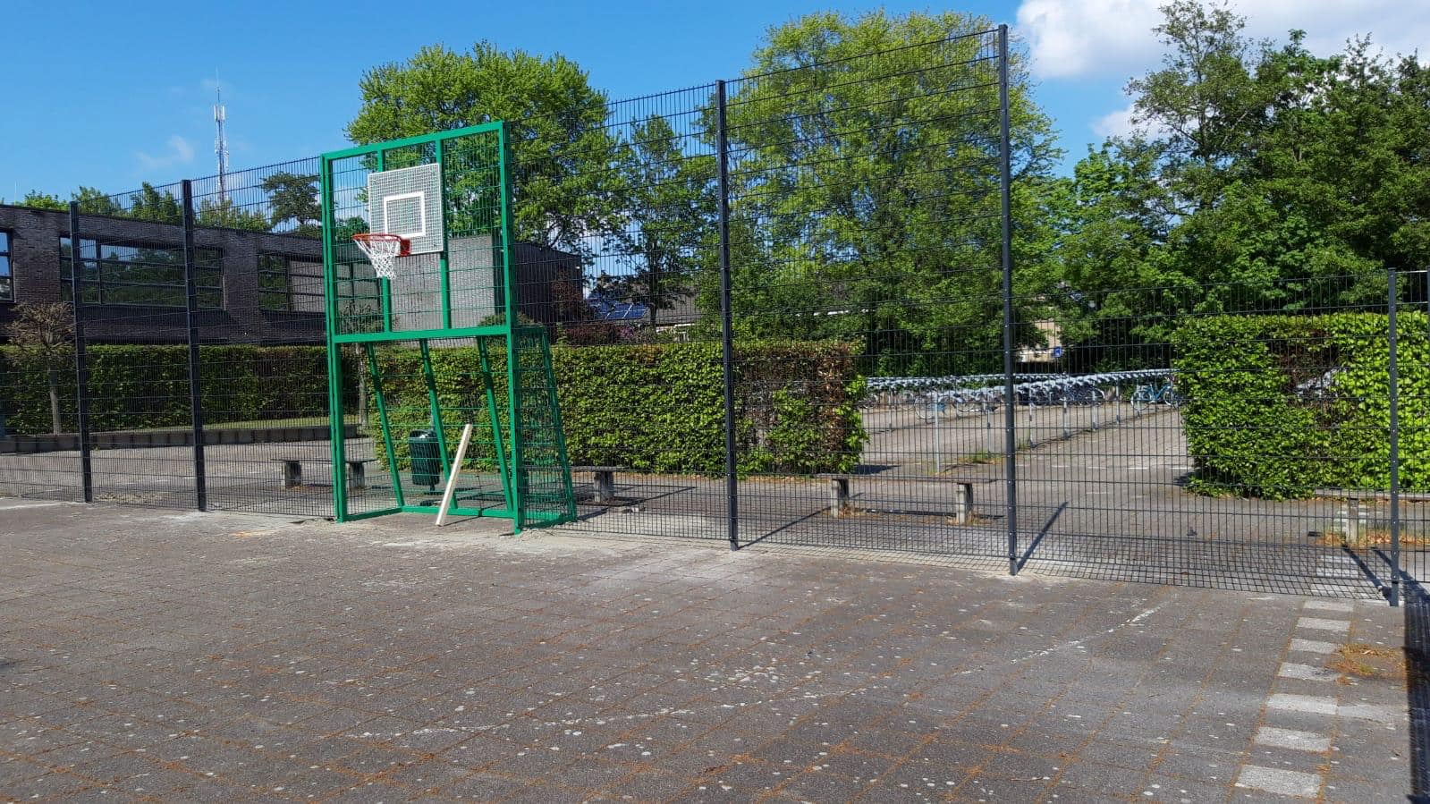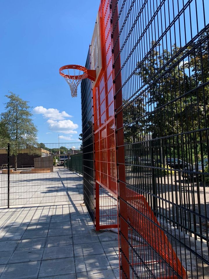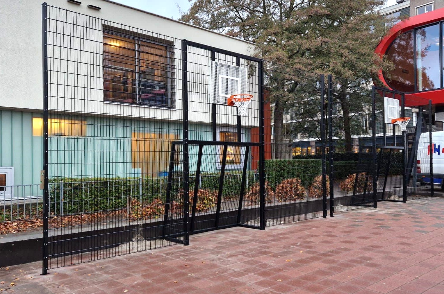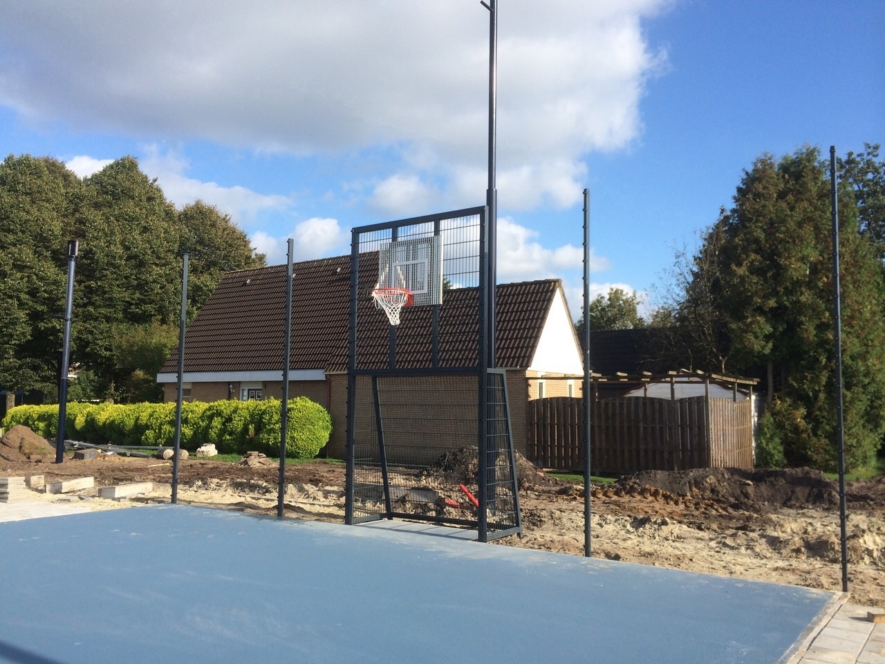 Tussen het geluidsarme vandalisme bestendige basketbalbord en de constructie, zit rubber zodat ook hier geen metaal op metaal geluid ontstaat!