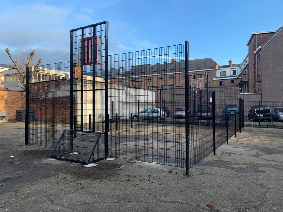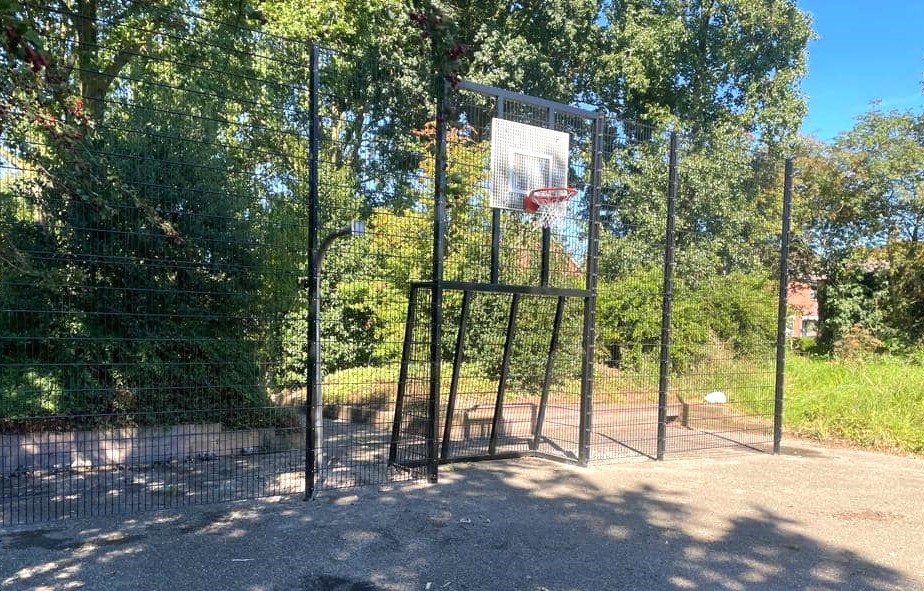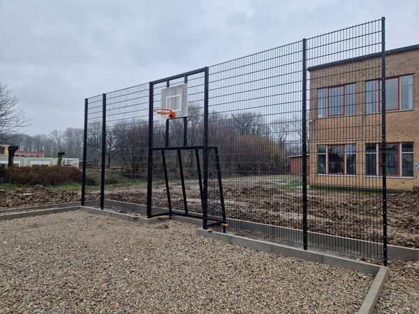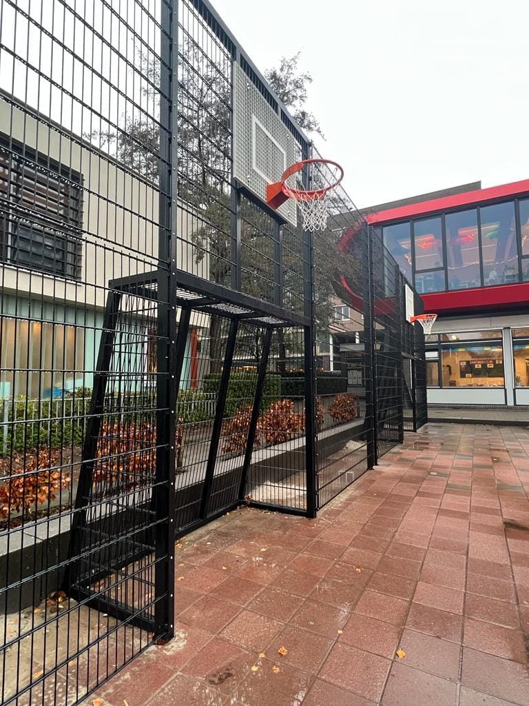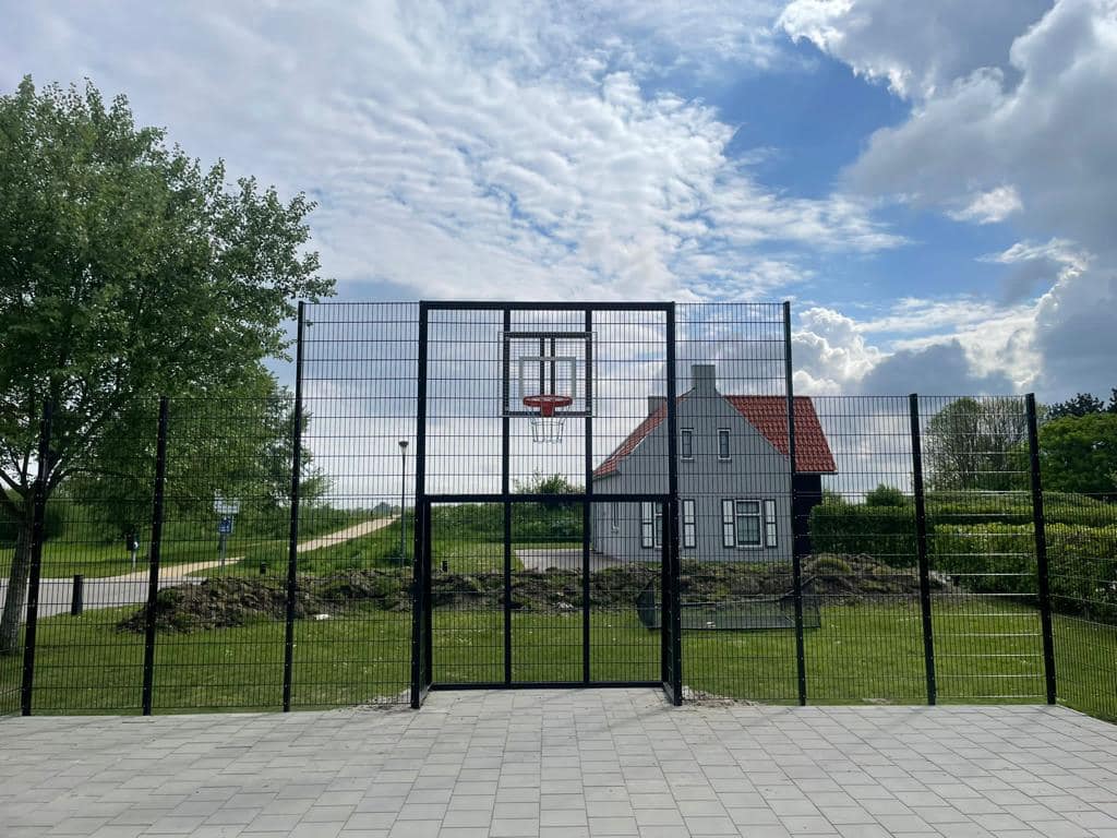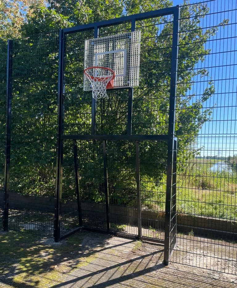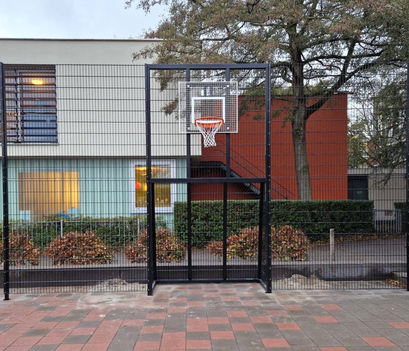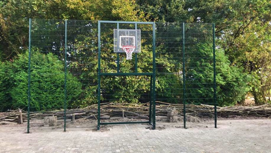 Tussen het geluidsarme vandalisme bestendige basketbalbord en de constructie, zit rubber zodat ook hier geen metaal op metaal geluid ontstaat!