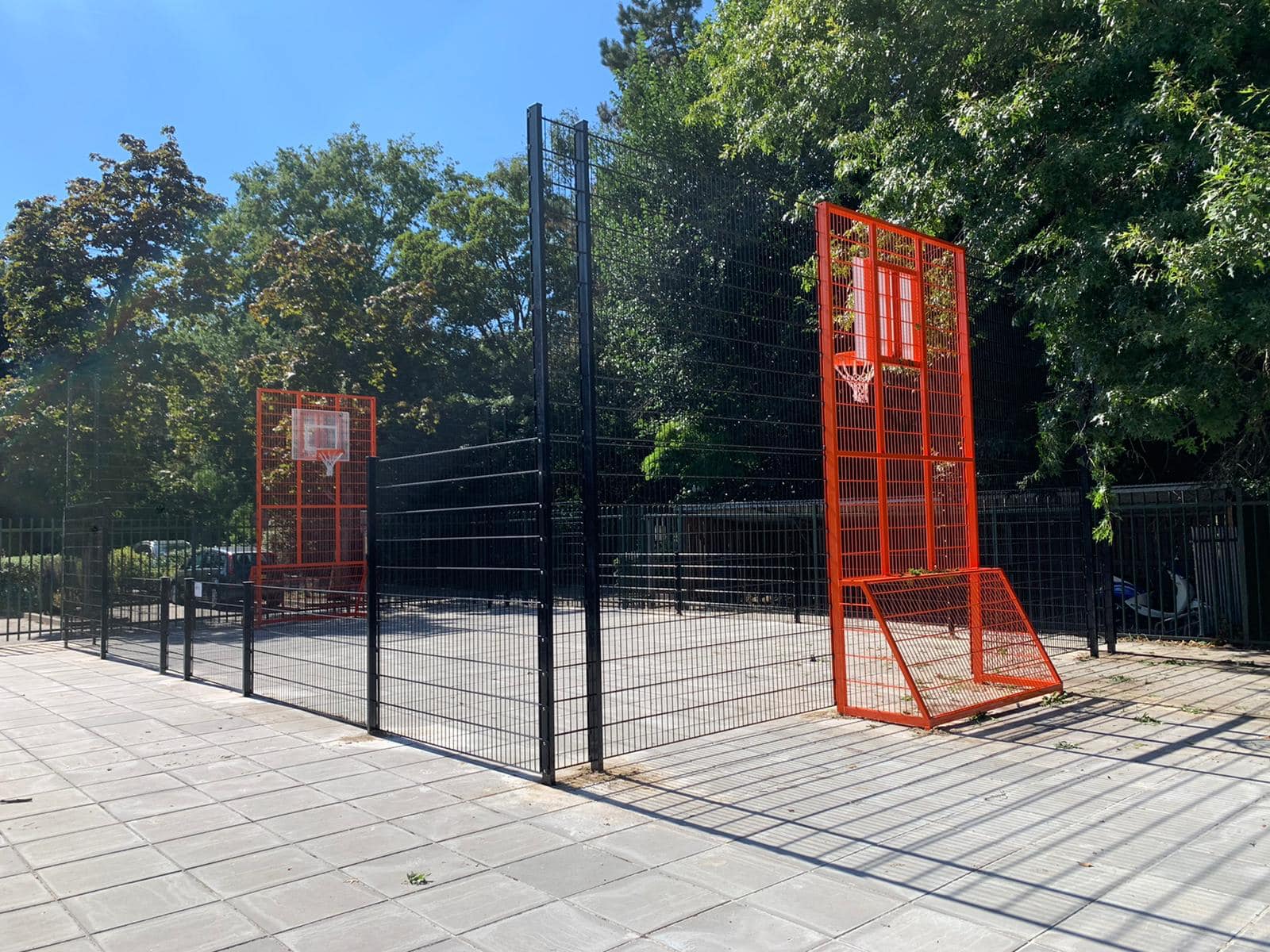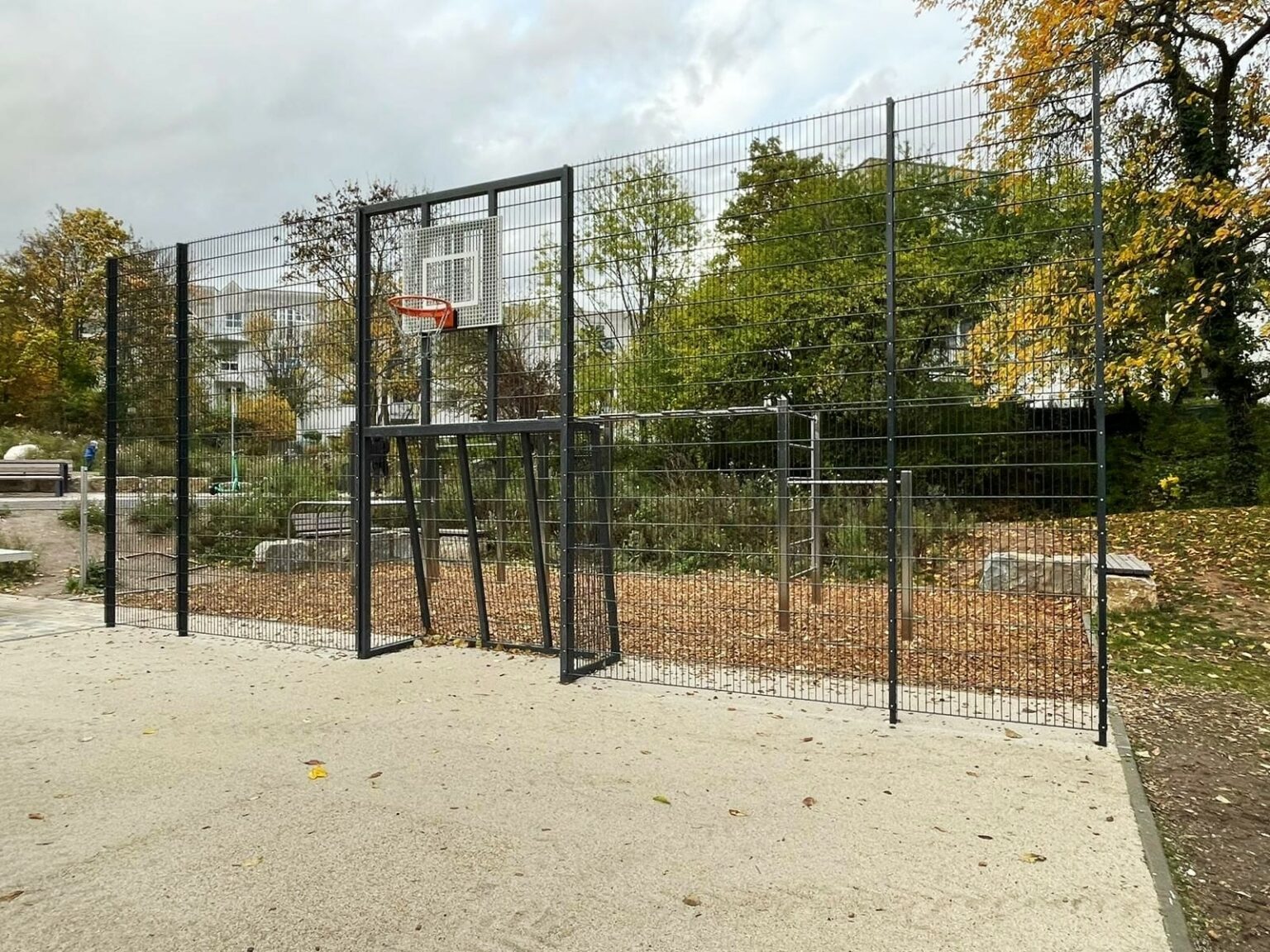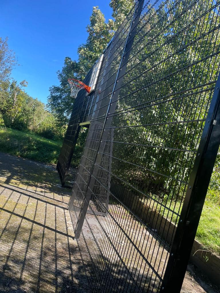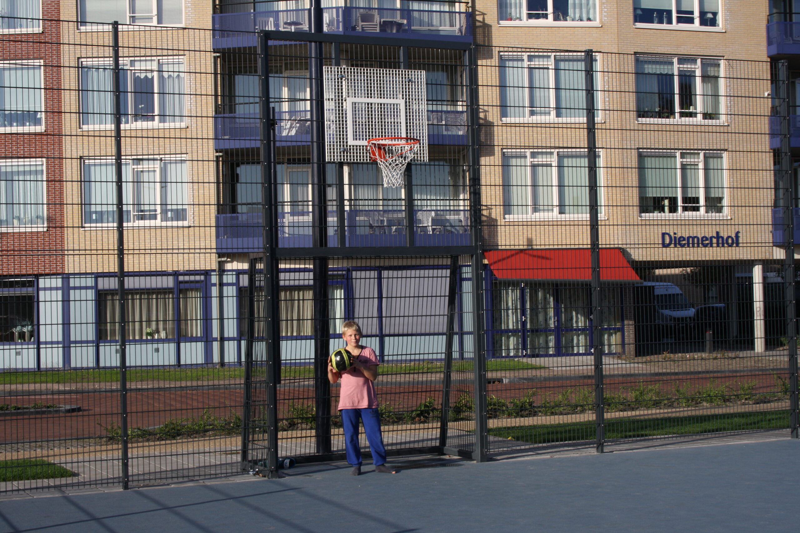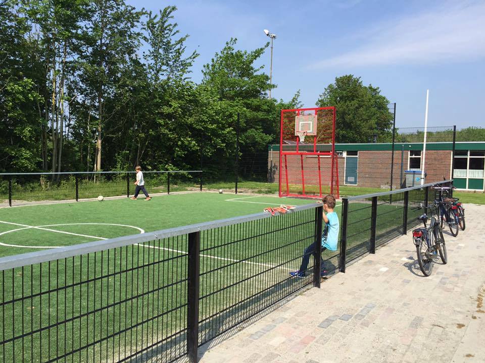 Tussen het geluidsarme vandalisme bestendige basketbalbord en de constructie, zit rubber zodat ook hier geen metaal op metaal geluid ontstaat!