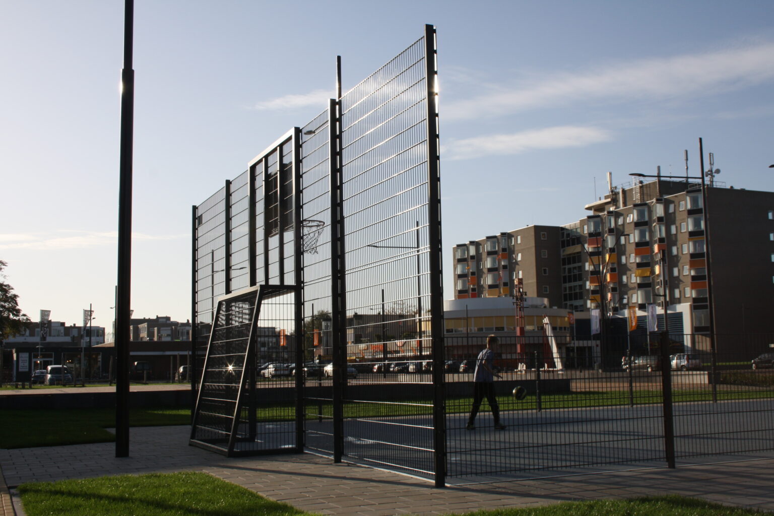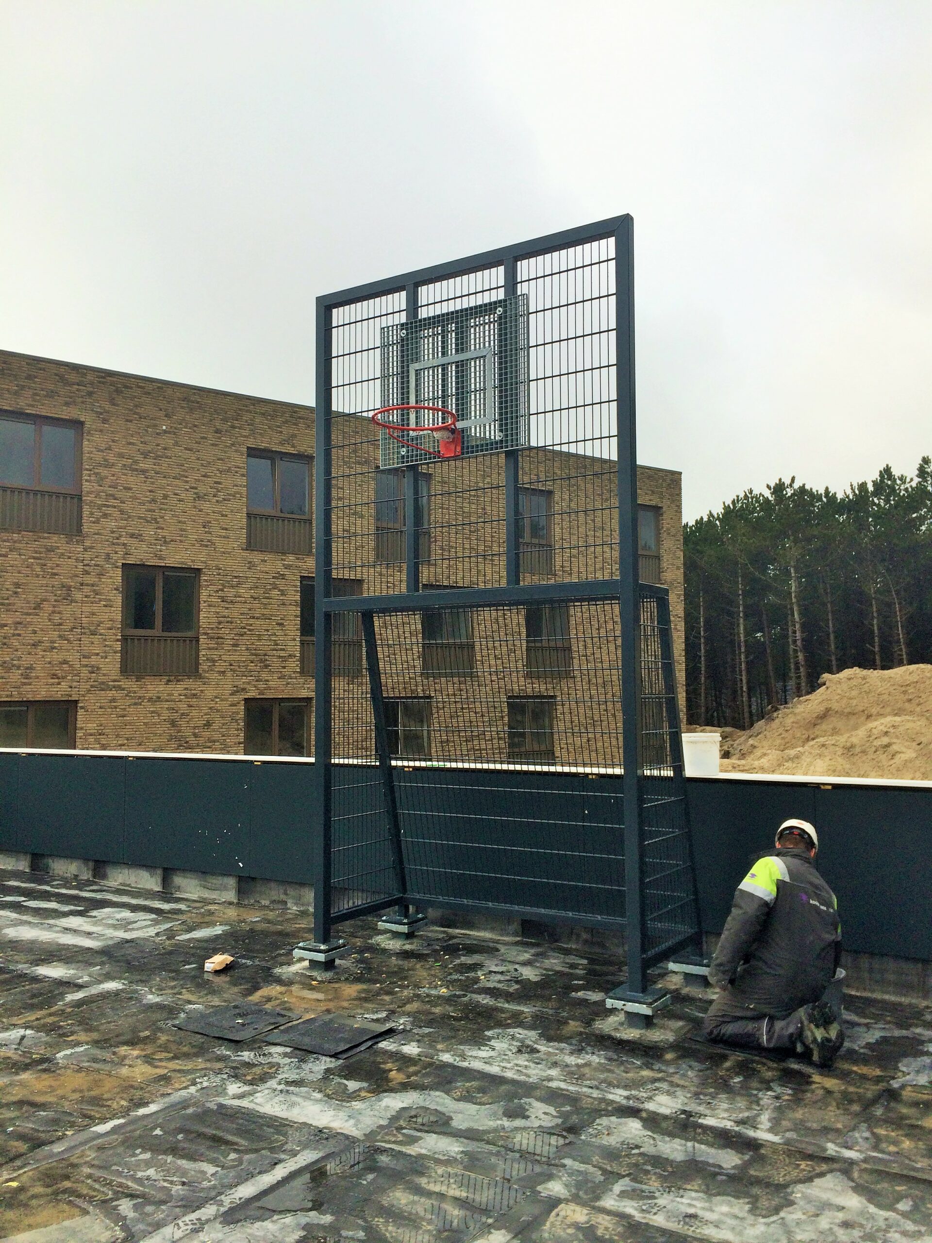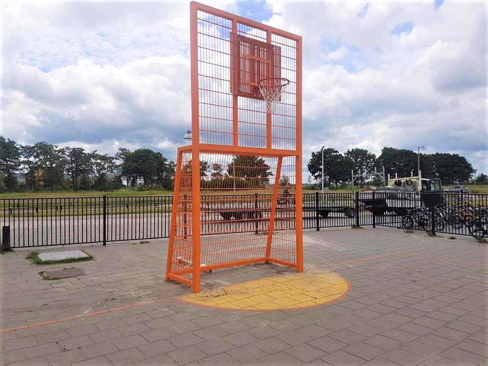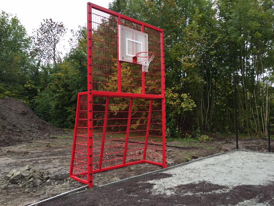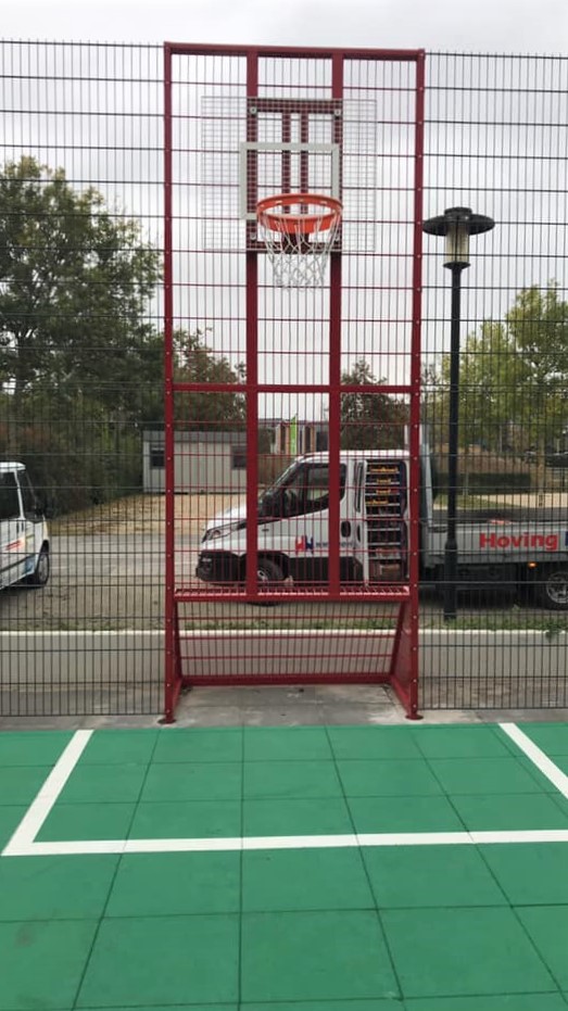 Geluids- en vandalisme arme sportwand. Leverbaar in een verzinkte uitvoering of in een ral-kleur van uw keuze. Voorzien van ons vandalisme- en geluidsarm basketbalbord. Volbad verzinkt na het lassen.