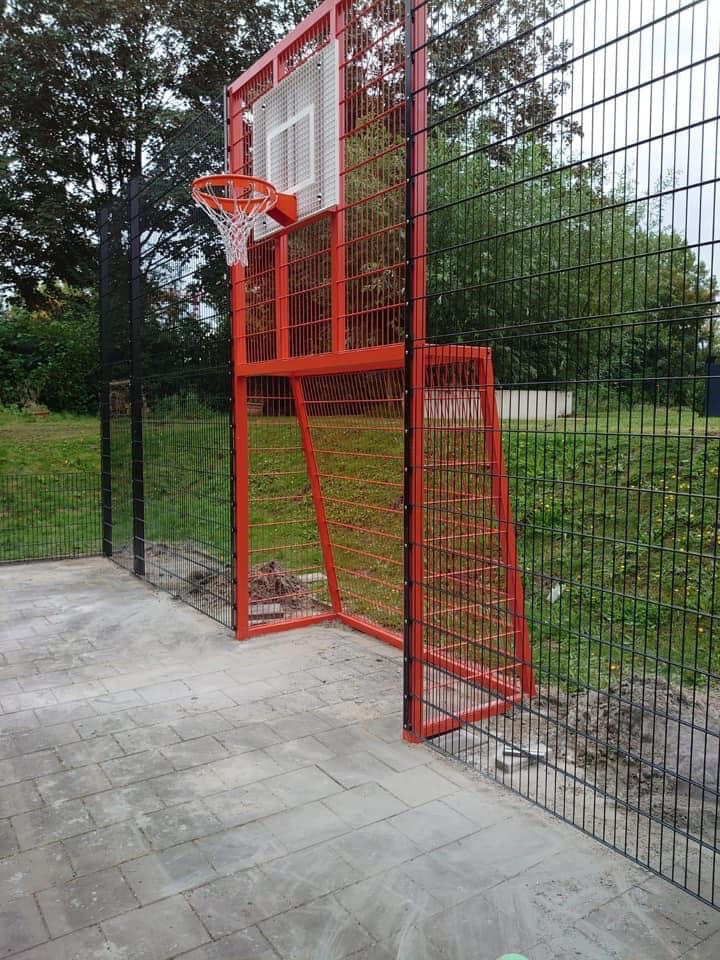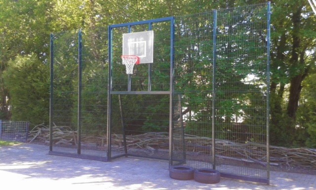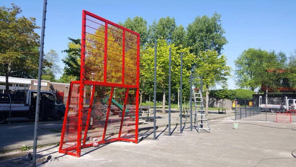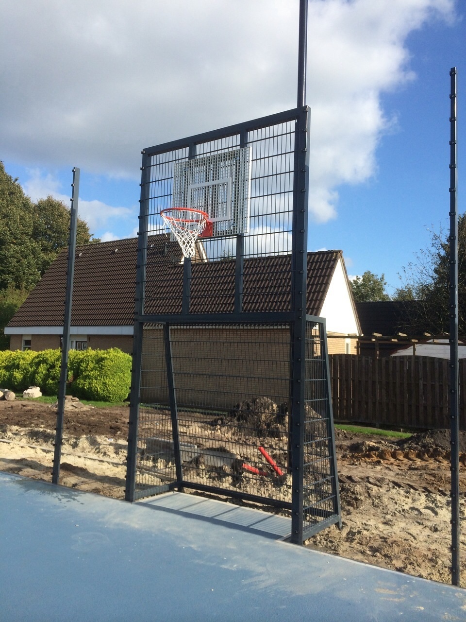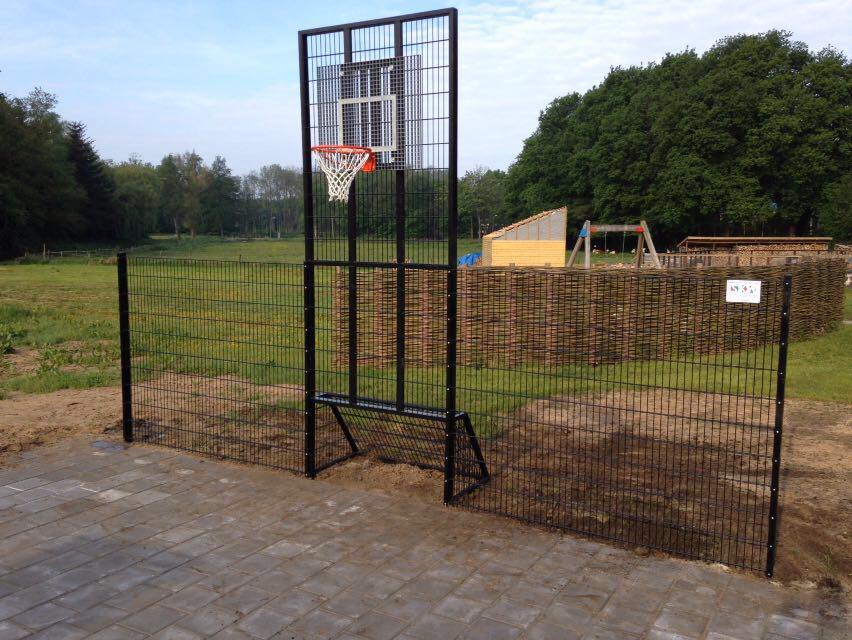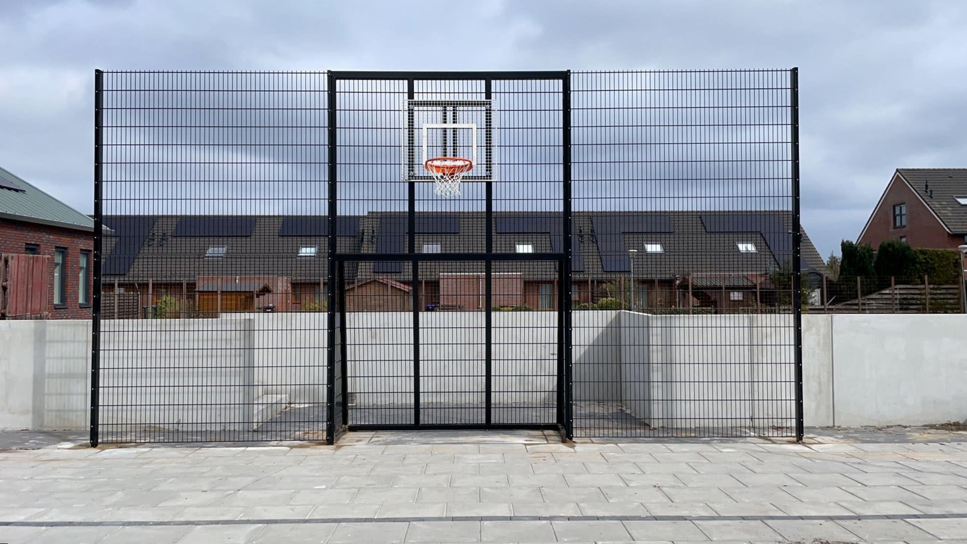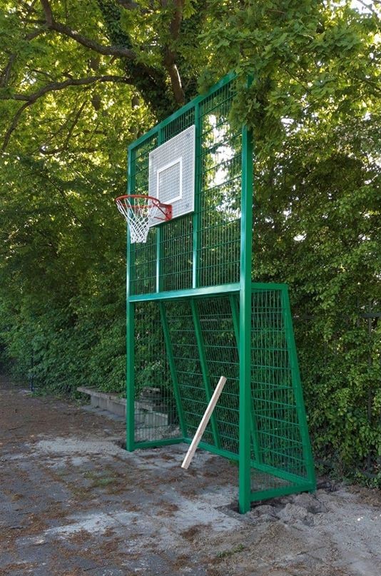 Geluids- en vandalisme arme sportwand. Leverbaar in een verzinkte uitvoering of in een ral-kleur van uw keuze. Voorzien van ons vandalisme- en geluidsarm basketbalbord. Volbad verzinkt na het lassen.