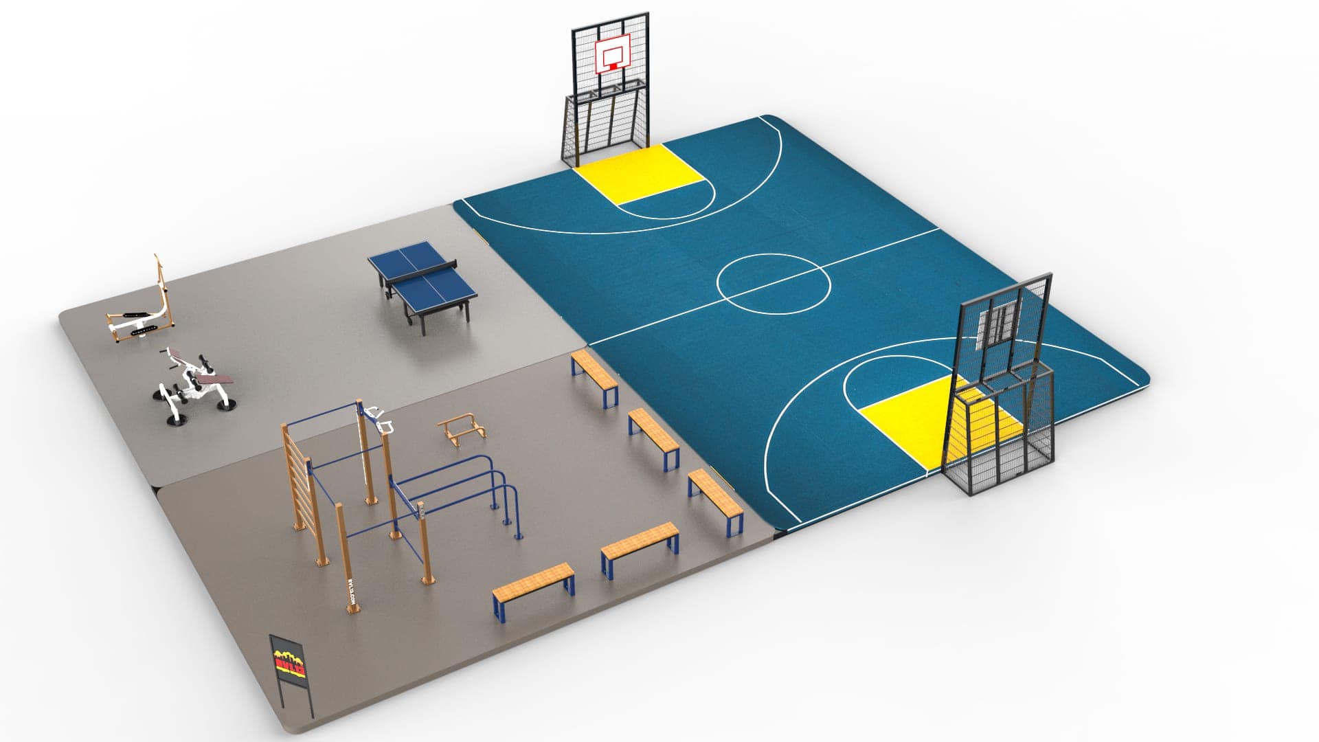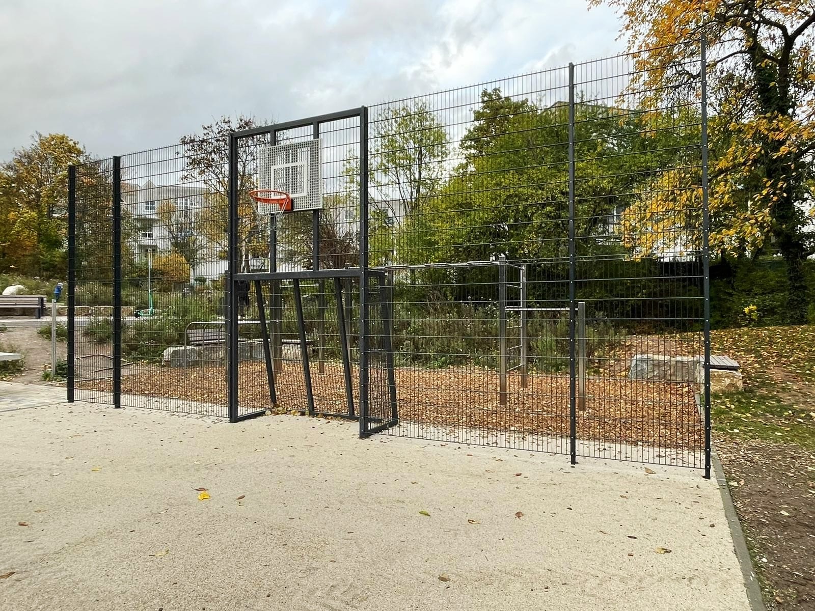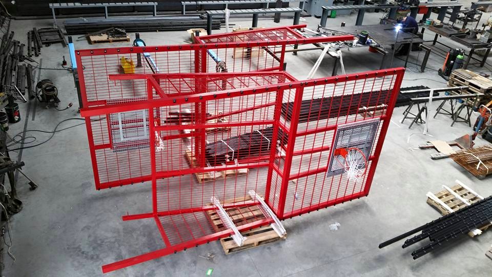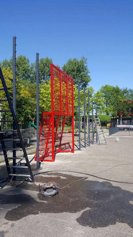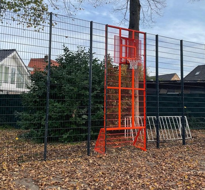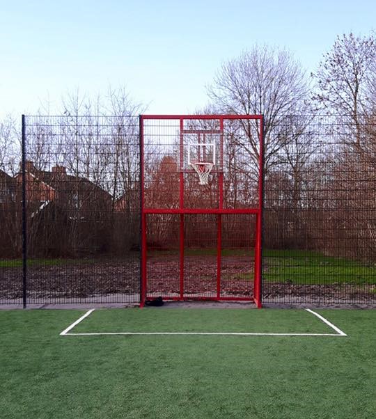 Geluids- en vandalisme arme sportwand. Leverbaar in een verzinkte uitvoering of in een ral-kleur van uw keuze. Voorzien van ons vandalisme- en geluidsarm basketbalbord. Volbad verzinkt na het lassen.