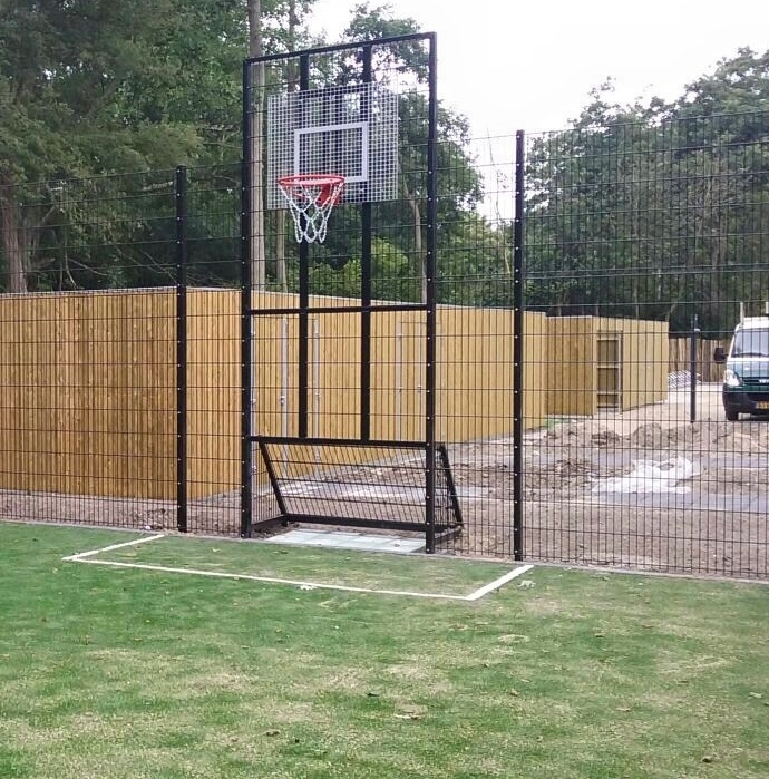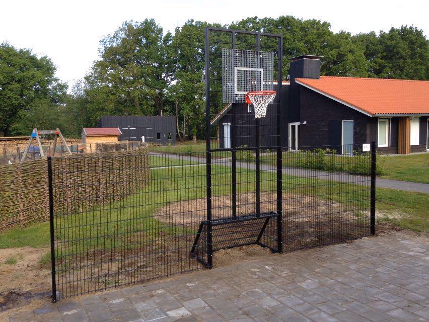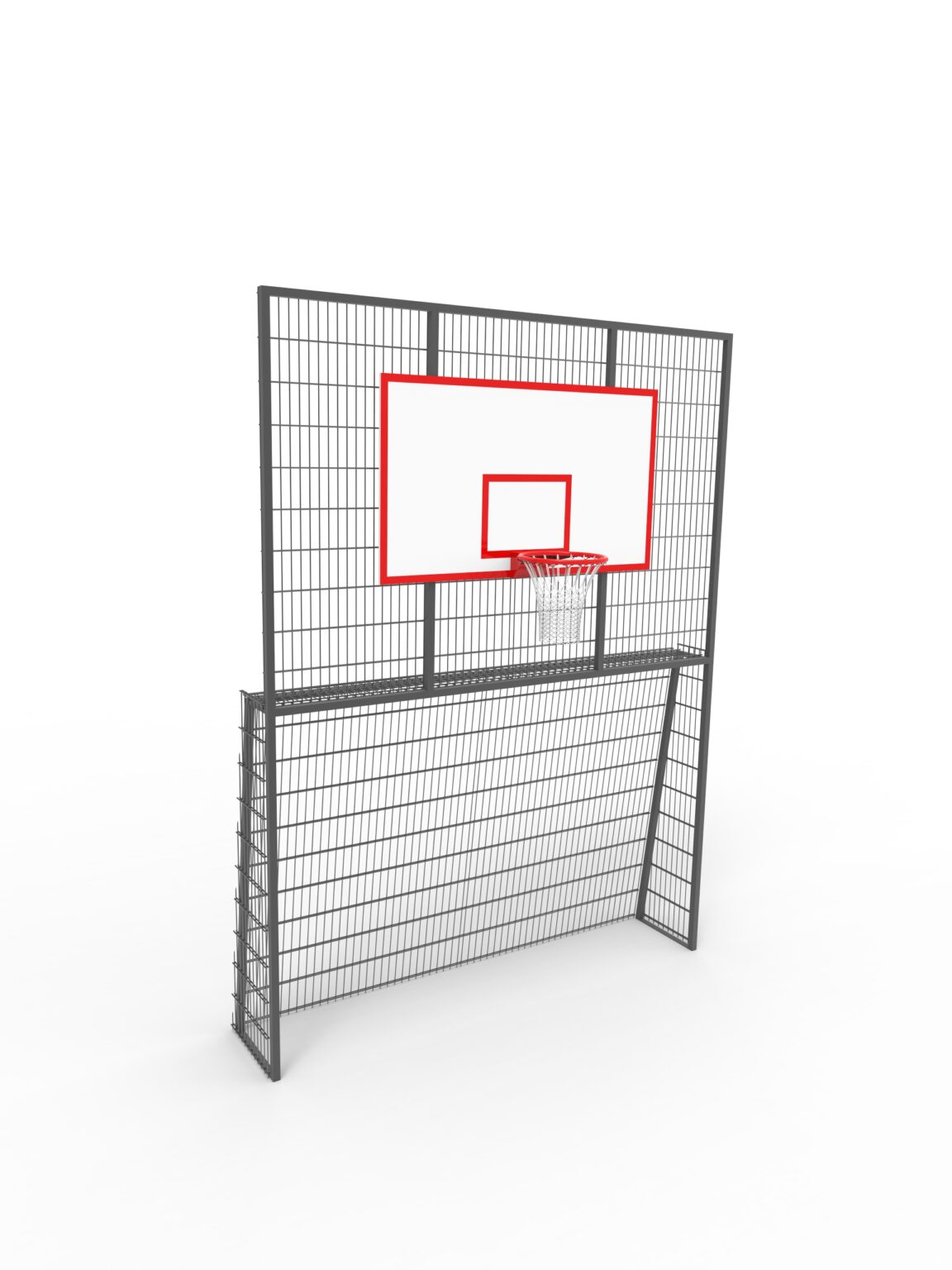 De voetbaldoel-basketbalcombinatie is een constructie van een voetbaldoel met daarachter een 4 meter hoge wand. Op deze wand zit een basketbalbord van 105 x 90 cm gelast. De breedte van het product varieert doordat u kunt kiezen uit drie uitvoeringen gespecificeerd door de afmetingen van de voetbaldoelen.