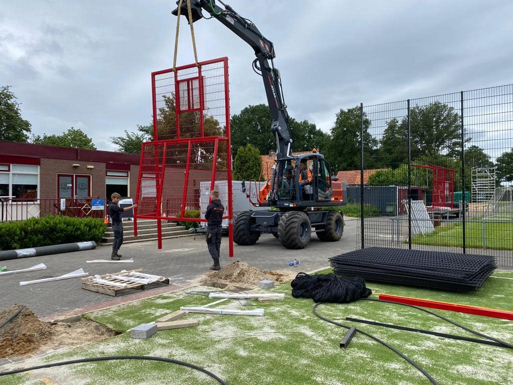 Op de afbeelding hieronder, ziet u de verlengde staanders, deze worden ingegraven en aangewerkt met beton. Hierdoor staat de voetbaldoel- basketbal-combinatie als een huis en kan er veilig gespeeld en gesport worden door uw jeugd. Op aanvraag kunnen we deze ook met voetplaten produceren voor montage op een betonnen ondergrond.